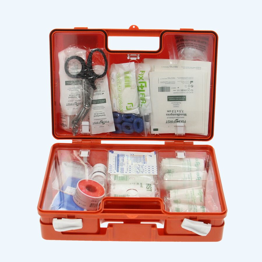 Man hofft, dass man sie nie braucht, aber laut niederländischem Gesetz müssen Verbandskästen in jedem Unternehmen vorhanden sein. Je nach den Arbeitsbedingungen wird festgelegt, welche spezifischen Anforderungen das Unternehmen hinsichtlich der Verfügbarkeit von Verbandskästen und Hilfsmitteln erfüllen muss. In jedem Firmengebäude oder Arbeitsplatz muss mindestens innerhalb von 30 Sekunden ein Verbandskasten vorhanden sein, also auch, wenn Sie mit Ihrem Firmenbus zu einem Auftrag fahren. Für kleine Betriebe, z. B. in der Binnenschifffahrt, mit Firmenwagen oder landwirtschaftlichen Fahrzeugen, reicht ein Verbandskasten B aus. Dieser ist genauso komplett wie der Standard-Verbandskasten, enthält jedoch kleinere Mengen aller Hilfsmittel.